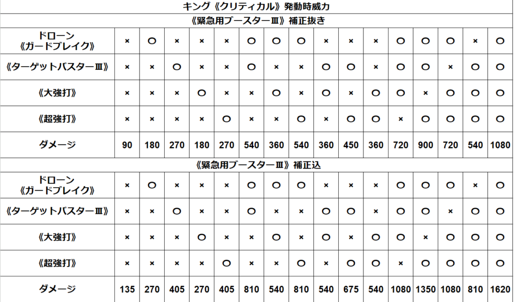 | ホログラム【キング】 | 《緊急用ブースターⅢ》適用済みで 最終防衛ドローン 《ガードブレイク》 発動ターン 《ターゲットバスターⅢ》 《大打撃》 《超打撃》 《クリティカル》 発動 1000超ダメージ ※上画像参照 | 《緊急用ブースターⅢ》適用済みで 最終防衛ドローン 《ガードブレイク》 発動ターン 最終防衛ドローン 《ターゲットロック》 or ホログラム【クイーン】 《コンボスターターⅤ》 を受けたお供に 《ターゲットバスターⅢ》 《大打撃》 《超打撃》 発動 2000超ダメージ 保証はできませんが 《ムーン・キャッスル》等の 高係数DF増スキルなら耐久可能かも (《ターゲットロック》のDF減係数が100%以下なら可) |