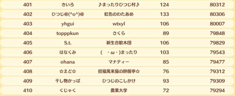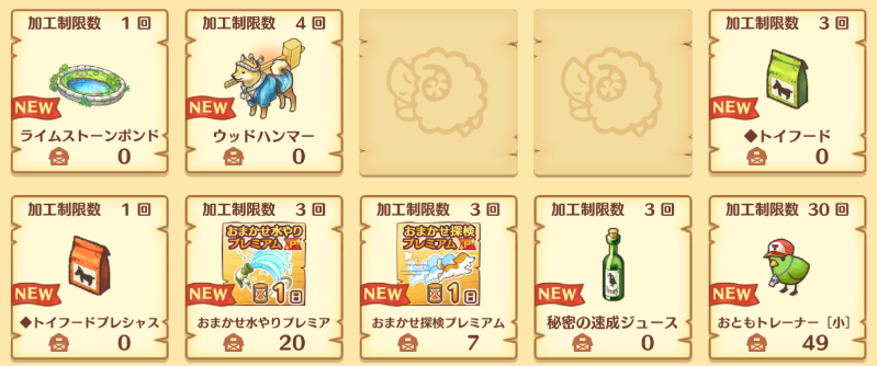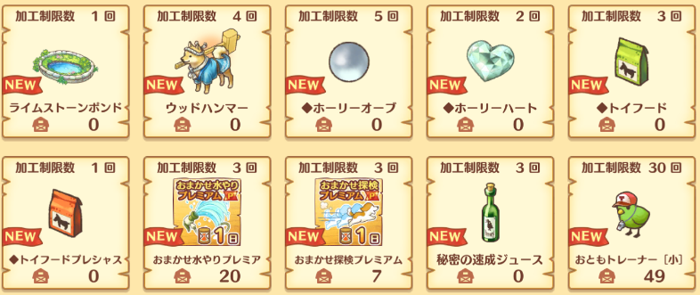 | AP上限増 | パティシエ帽系統 牧場エンブレム 牧場マスターエンブレム らくえんマスターエンブレム ……等 | オブ・アップル系統 周年記念コサージュ ……等 |