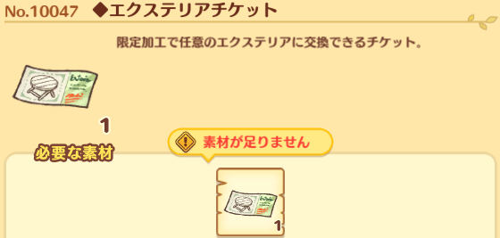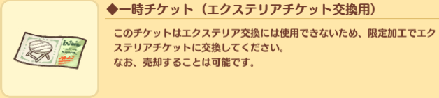 ◆一時チケットも◆エクステリアチケットの12月版と同様に狩猟祭終了後もう1週間所持できますが、10047番の加工が翌週も残っている保証は無いので纏めておいた方がよいかと