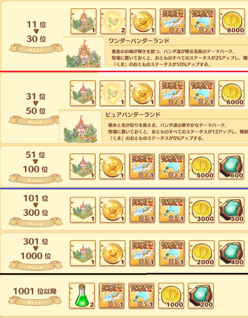| ワンダーパンダーランド | 1~30位 | 10%+25 | 25 |