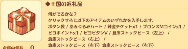 《王国からの返礼品》◆王国からの返礼品加工4種開放 ◆王国からの返礼品 入手? : 1 ◆あみぐるみハート 入手 : 1 ※もしかしたら◆名誉ボタン200個の ブラミッション受取でも入手(加工)タスク進むかも? |