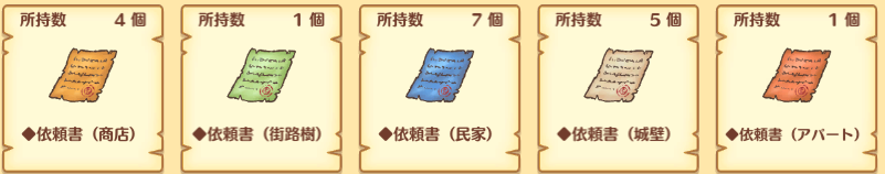 ◆依頼書(城壁) ◆依頼書(民家) ◆依頼書(アパート) ◆依頼書(商店) ◆依頼書(街路樹) | 実質5 抽選なので、ピンポイントで欲しい 依頼書のAPは膨れ上がる |