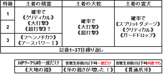 | 土着の精霊 | 6500 | 200台? | 中 | 大雑把に500 | 《大地の鎧》 自HP63~72%以下 自 : DF50%増(2T) 自 : 当スキル仕様設定消滅 発動時以下スキル判定キャンセル |