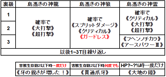| 島憑きの神龍 | 約900 | 中 | 神狼*4/3以上 | 《牙の鋭さが増した!》 害獣2体以下 自 : AK75%増(98T) 自 : 当スキル仕様設定消滅 発動時以下スキル判定キャンセル |