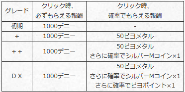 | 【クリック】 | システム チキン AP回復 : 3 EP回復 : 3 | システム ケーキ AP回復 : 5 EP回復 : 5 | システム チョコケーキ AP回復 : 5 EP回復 : 5 |