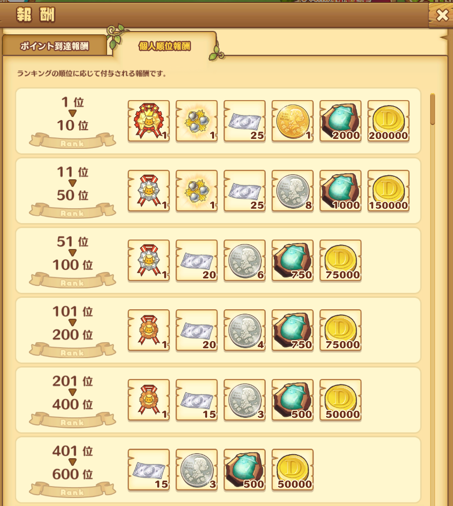 ランキング争いはほぼ10位争い一点に集約、他ラインは50位の紋章が次点で汎用報酬で比較程度です